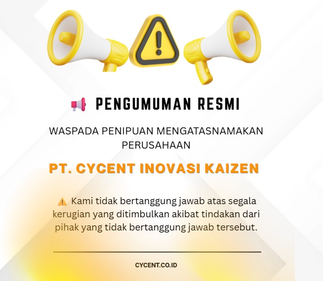 Waspada Penipuan mengatasnamakan PT. Cycent Inovasi Kaizen. Kami menghimbau seluruh pihak untuk berhati-hati dan tidak mudah percaya terhadap oknum yang mengatasnamakan perusahaan PT. Cycent Inovasi Kaizen.